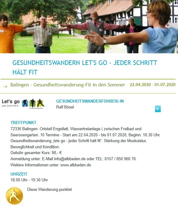 Beim Gesundheitswandern „Let´s go – jeder Schritt hält fit“ wird natürlich gewandert. Das Besondere passiert unterwegs: An schönen Plätzen in der Natur werden gemeinsam Übungen gemacht, die Koordination, Kraft, Ausdauer und Entspannung verbessern. Zum Gesundheitswandern benötigen Sie gutes Schuhwerk (Wander/Turnschuhe) sowie bequeme Kleidung.